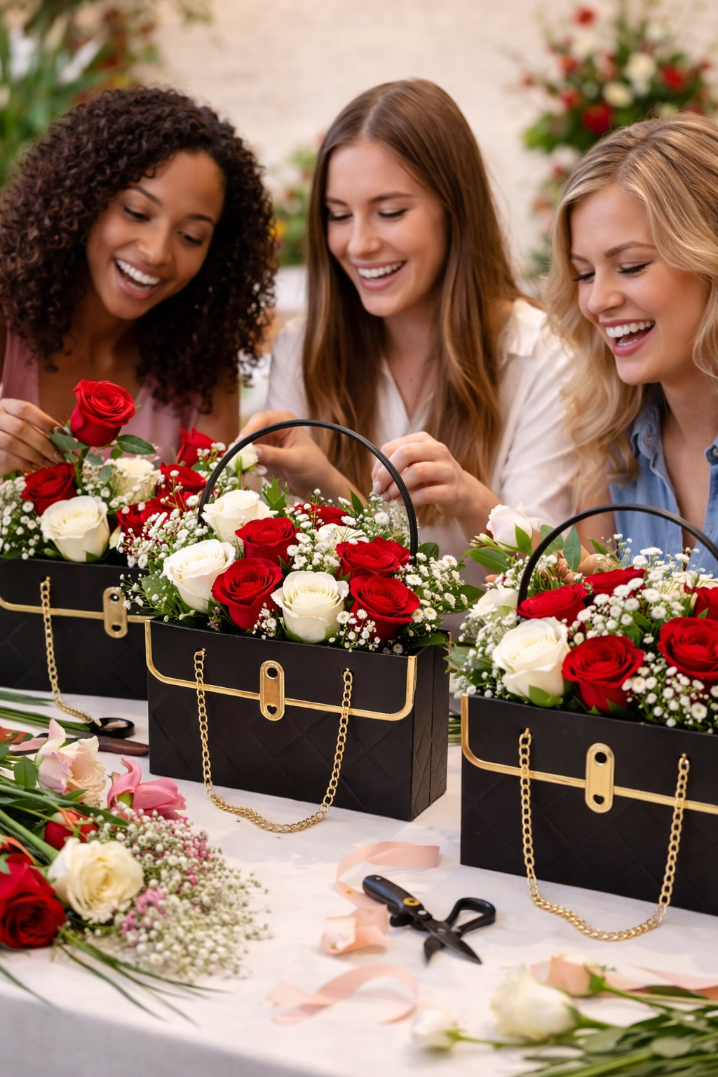 Turn heads with our Signature Bloom Purse Bouquet, a stunning blend of elegance and creativity. Designed in a chic handbag-style box with gold accents, this arrangement features a luxurious mix of fresh roses, delicate fillers, and lush greenery.